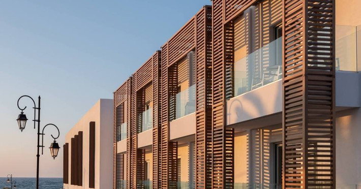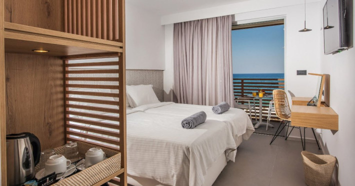 Dotari camere: Ammos Beach Resort dispune de 78 de camere spatioase si moderne dotate cu aer conditionat, wi-fi, telefon (cu plata), seif, TV satelit, frigider, baie cu dus si uscator de par, halat si papuci, balcon/terasa.
