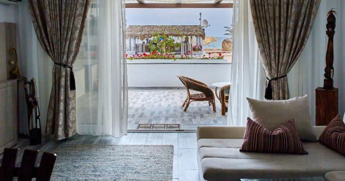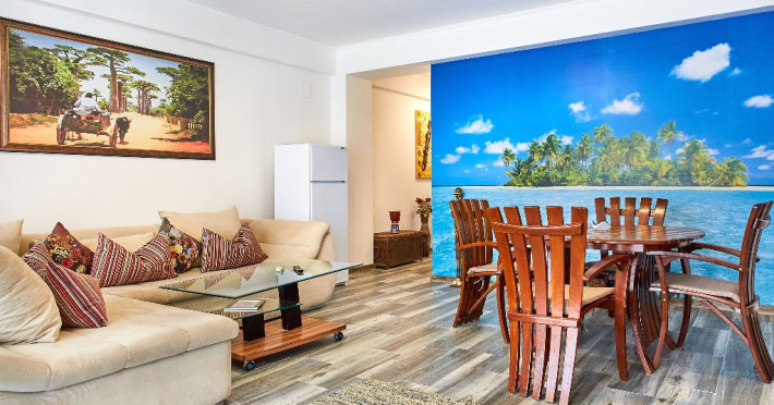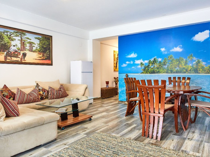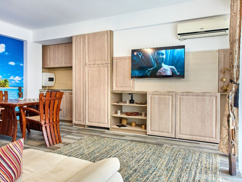 FACILITATI SI SERVICII Locatia este una de vis datorita amplasarii chiar la malul Marii Negre cu iesire la plaja Boeme. Oaspetii din acest resort au parte de rasarituri unice, relaxare si spatiu intim. Sunt binevenite atat cuplurile cat si familiile cu copii. Fiecare apartament are parcare privat si internet. Sunt mobilate si utilate modern, alcatuite din 2 camere, sufragerie open space cu canapea extensibila si dormitor cu pat matrimonial. Bucataria este dotata cu plita electrica, cuptor, frigider si vesela. Apartamentele au un design exotic si va duce cu gandul la MADAGASCAR si BORA BORA.