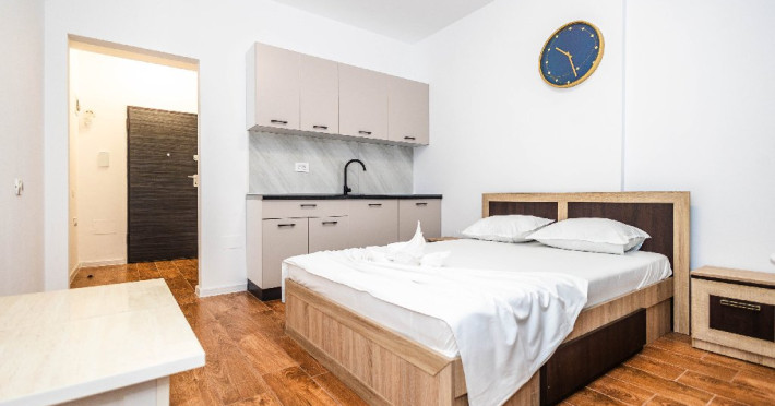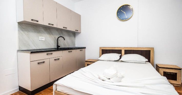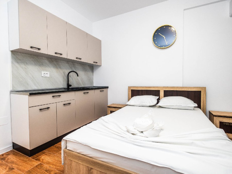 Bucataria este complet utilata si conceputa pentru a raspunde nevoilor turistilor: dispune de frigider, plita electrica, chiuveta, vesela si ustensile, astfel incat sa puteti pregati sau savura mese usoare chiar in apartament. Mobilierul este bine compartimentat, iar spatiul este eficient organizat.