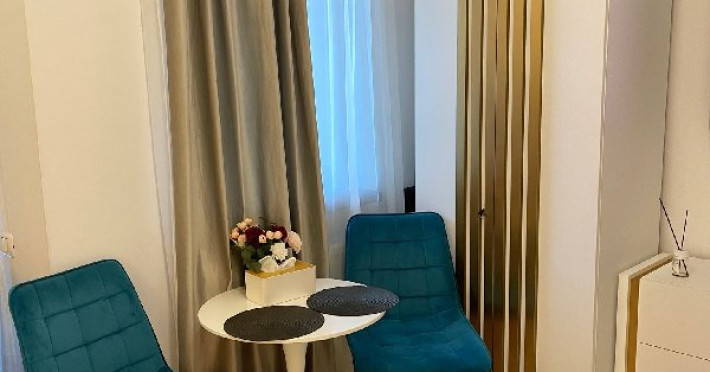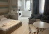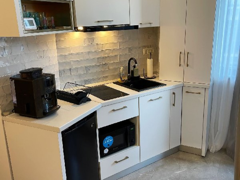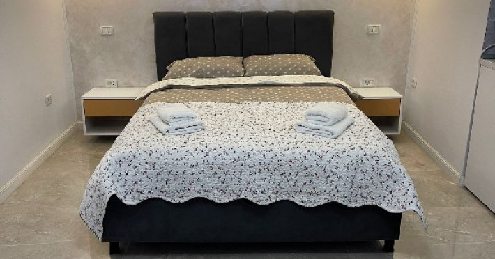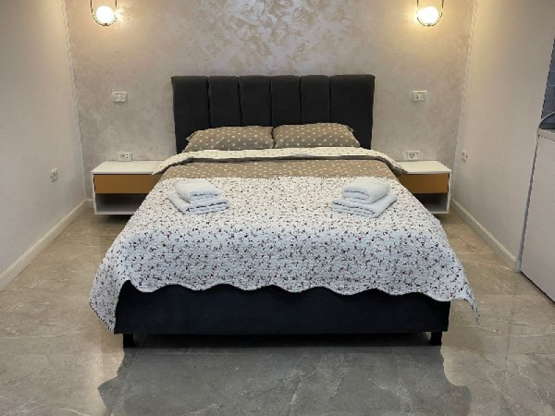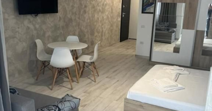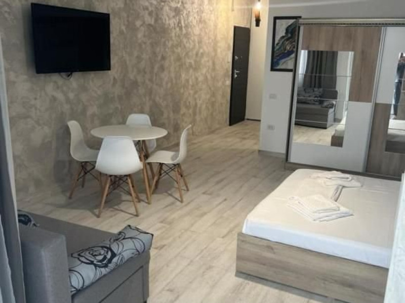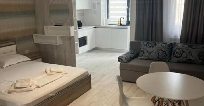 Studio-ul are o capacitate de cazare de 3 adulti si 1 copil, fiind amenajat modern si confortabil. Dispune de un pat matrimonial elegant si o canapea extensibila, creand un ambient placut si relaxant.