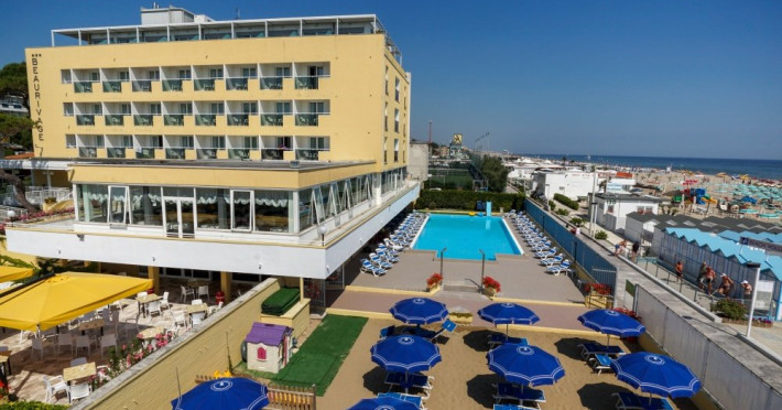 Descriere HOTEL BEAURIVAGE: Hotelul situat in Riccione, este o alegere excelenta pentru calatorii interesati de viata de noapte, litoral si plaje cu nisip. Tip masa: Demipensiune / Light All Inclusive Localizare HOTEL BEAURIVAGE: Hotelul este situat in Riccione, cu acces direct la plaja. Plaja: Plaja direct in fata hotelului. Dotari camere: Toate cele 73 de camere sunt dotate cu: aer conditionat, TV, Wi-Fi, telefon, seif. Camerele cu vedere frontala la mare nu au balcon. Facilitati HOTEL BEAURIVAGE: : Hotelul ofera oaspetilor sai multiple facilitati: restaurant, Wi-Fi, aer conditionat, parcare, animatie, piscina echipata cu sezlonguri si umbrele, mini club pe plaja. Taxa de statiune se plateste la receptie: - aprox 0.7 euro/persoana/ noapte la hotel 2*; - aprox 1.5 euro/persoana/ noapte la hotel 3*; - aprox 2.5 euro/persoana/ noapte la hotel 4*. Persoanele care nu au implinit 14 ani sunt neplatitoare. Web: www.hotelbeaurivage.biz