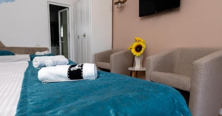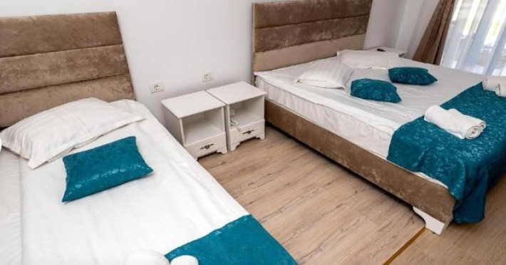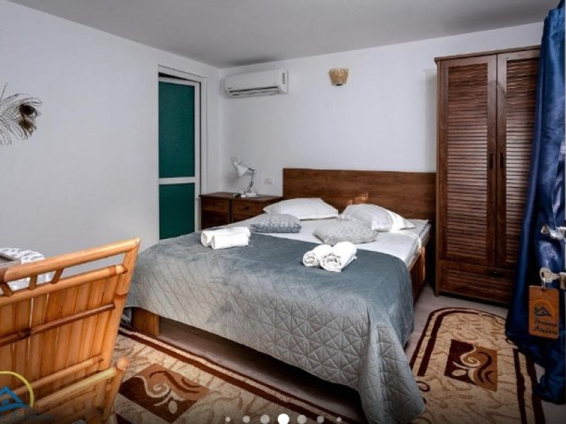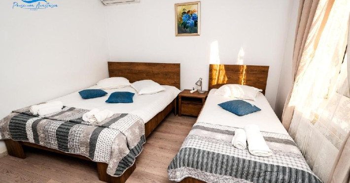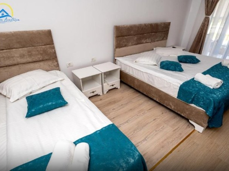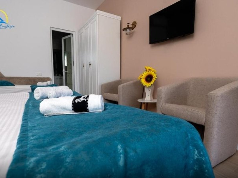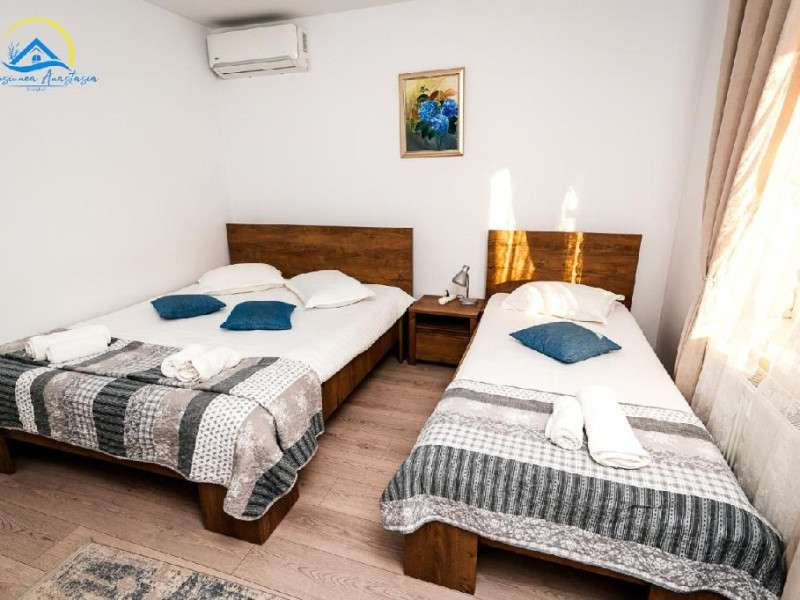 INFORMATII GENERALE Casa Anastasia se afla in Delta Dunarii in localitatea Murighiol, iar accesul se poate face direct cu masina. FACILITATI UNITATE Locatia reprezinta un amestec traditional si contemporan in inima Deltei si care respecta arhitectura si traditiile zonei. Include spatii de cazare moderne, restaurant, piscina exterioara, sauna, loc de joaca exterior, parcare, internet Wi-Fi. DESCRIERE CAMERE Cazarea se face in 4 corpuri de cladire, iar repartizarea are loc la check-in. Camerele duble sunt situate la parter, iar apartamentul se afla la etaj. O parte din camerele duble dispun de pat matrimonial, iar celelalte ofera doua paturi twin. Camerele triple dispun de un pat matrimonial si un pat single. Camera cvadrupla dispune de doua paturi matrimoniale. Apartamentul include doua camere in care se afla cate un pat matrimonial. Toate camerele dispun de baie proprie, TV, uscator de par, mini frigider. LOCALIZARE Casa Anastasia se afla in Delta Dunarii in localitatea Murighiol, iar accesul se poate face direct cu masina. ATRACTII TURISTICE Cetatea Halmyris, Manastirea Halmyris, Lacul Murighiol. SERVICII DE MASA Mesele se servesc in restaurantul propriu. FACILITATI COPII Piscina exterioara, loc de joaca pentru copii.
