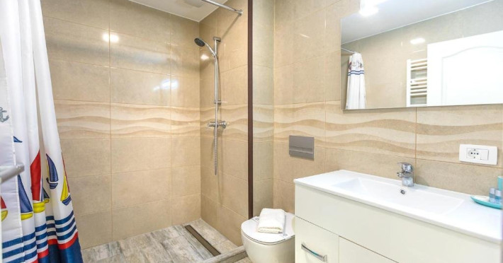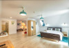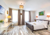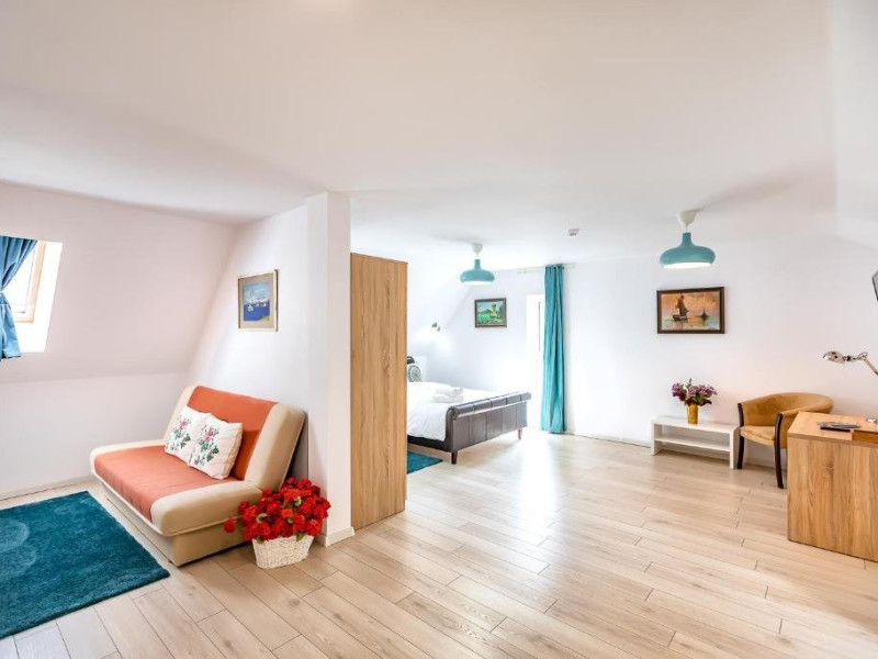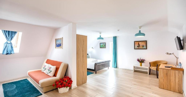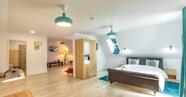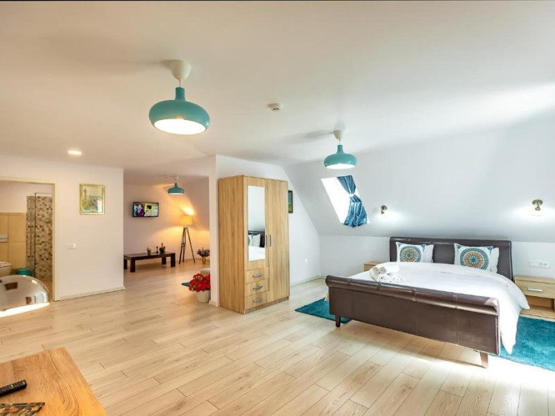 Camera dubla superioara - Dormitor (pentru 3 persoane, cu pat matrimonial, fotoliu extensibil, dulap de haine, baie proprie (dus) si WC (in baie)