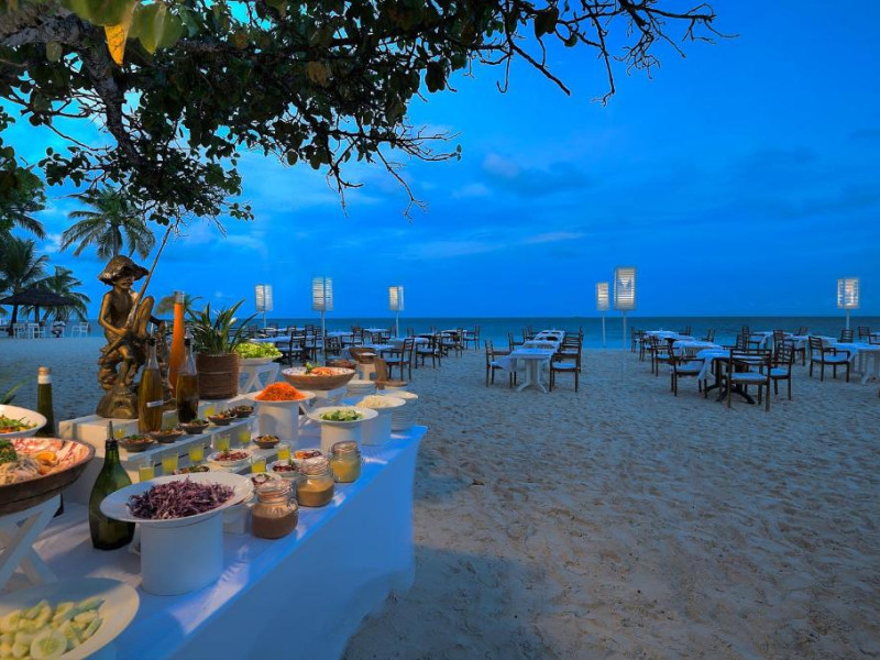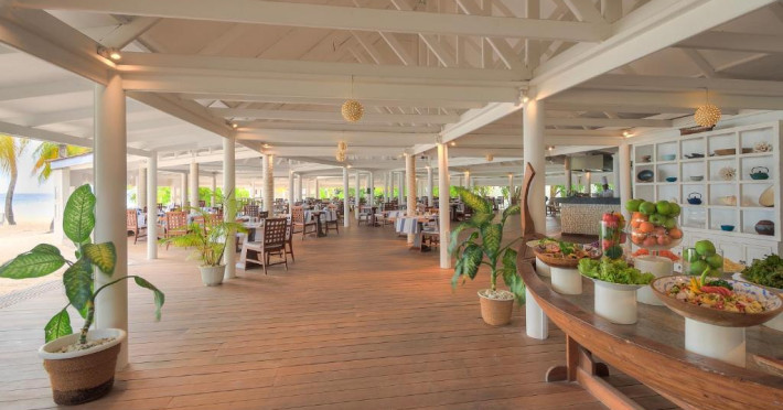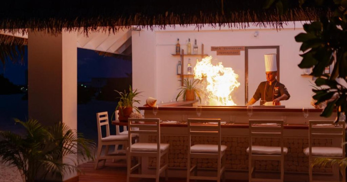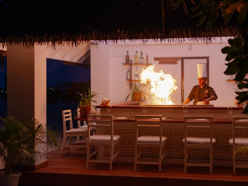 Complexul oferă 5 restaurante diferite, bucătari exceptionali si o pasiune pentru bucătăria de cele mai inalte standarde. Restaurantul Thari Over Water este gratuit numai pentru oaspetii Vilei pe Apă. Restaurantul maldivian Farivalhu, restaurantul japonez Thila si restaurantul cu specific marin Kakuni implică un cost suplimentar pentru toti oaspetii. Barul pe plajă Boli asigură mese usoare si gustări fără niciun cost suplimentar.