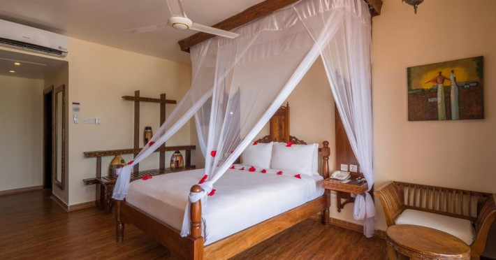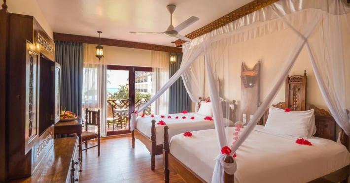 Dotari camere DoubleTree Resort by Hilton Hotel Zanzibar Nungwi ofera camere queen cu vedere la gradina, piscina sau ocean. Toate unitatile de cazare includ dotari standard, precum aer conditionat, conexiune Wi-Fi gratuita, TV LCD cu receptie satelit, dulap, pat cu baldachin, seif, minibar, cana fierbator, balcon sau terasa cu zona de relaxare, baie privata cu dus, articole de toaleta gratuite, uscator de par, prosoape, plase anti-insecte, prize langa pat.
