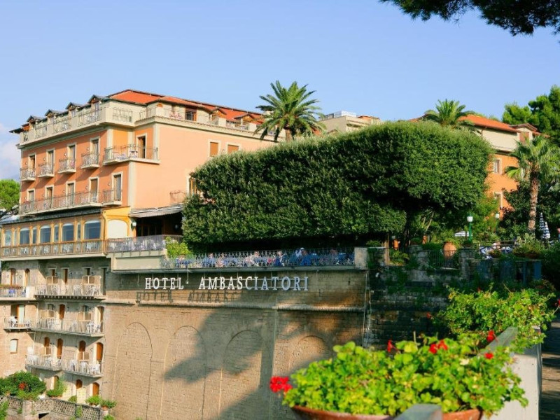 Descriere: Grand Hotel Ambasciatori este un hotel cochet cu vedere la Marea Tireniana, situat la 5 minute de mers pe jos de Piazza Tasso. Localizare: Se afla la 52 km de Aeroportul International din Napoli. Facilitati hotel: Hotelul ofera clientilor plaja privata, gradina cu piscina, restaurant, bar, teren de tenis. Dotari camere: Camerele sunt dotate cu wifi, aer conditionat, mini bar, telefon, TV, radio. Site web: https://www.ambasciatorisorrento.com/ Nota informativa: Pentru anumite facilitati din hotel sau din camera, hotelierul poate solicita taxe suplimentare. In momentul sosirii la hotel solicitati receptionerului sa va informeze cu exactitate asupra lor. Taxa de sejur se va achita de catre clienti direct la hotel.