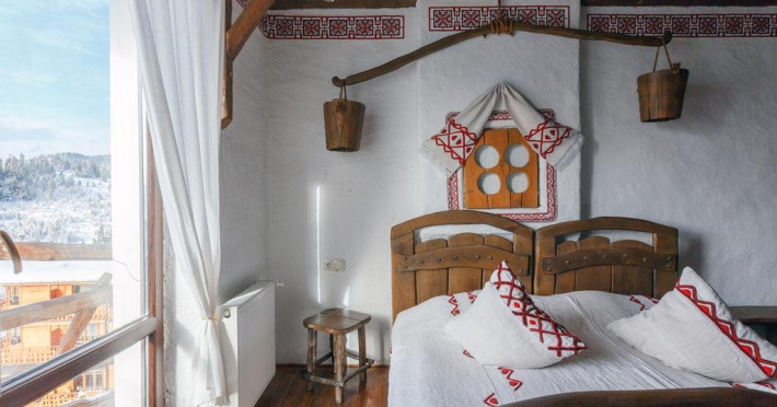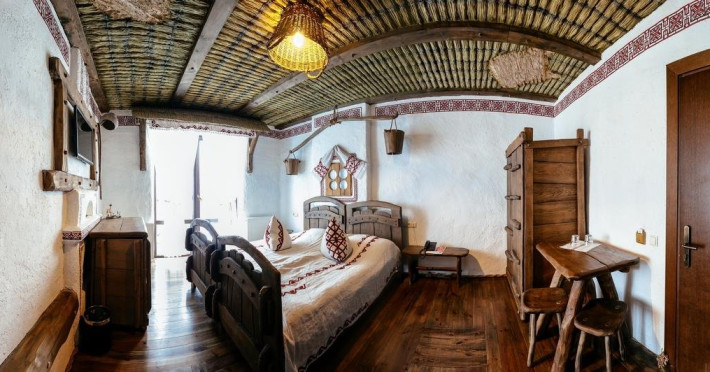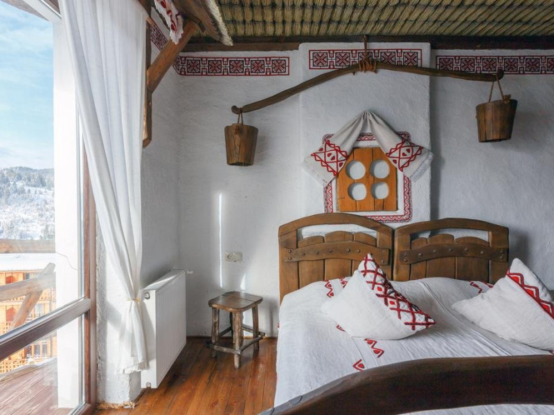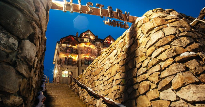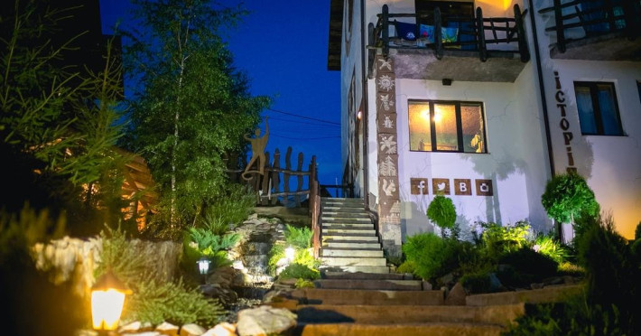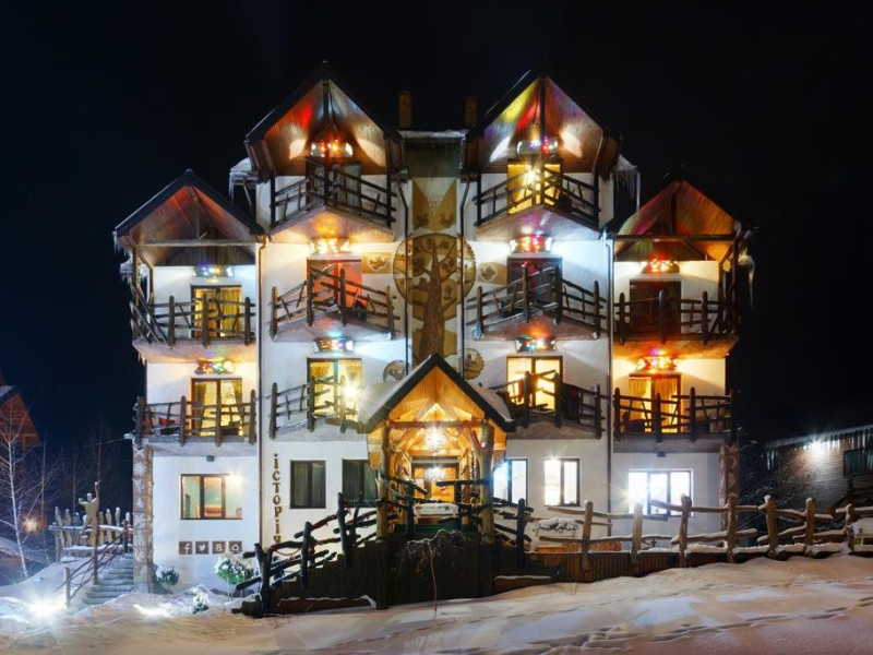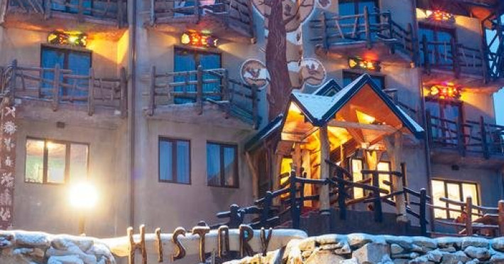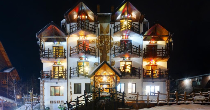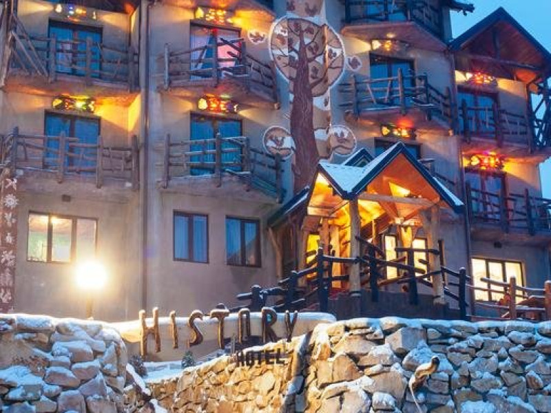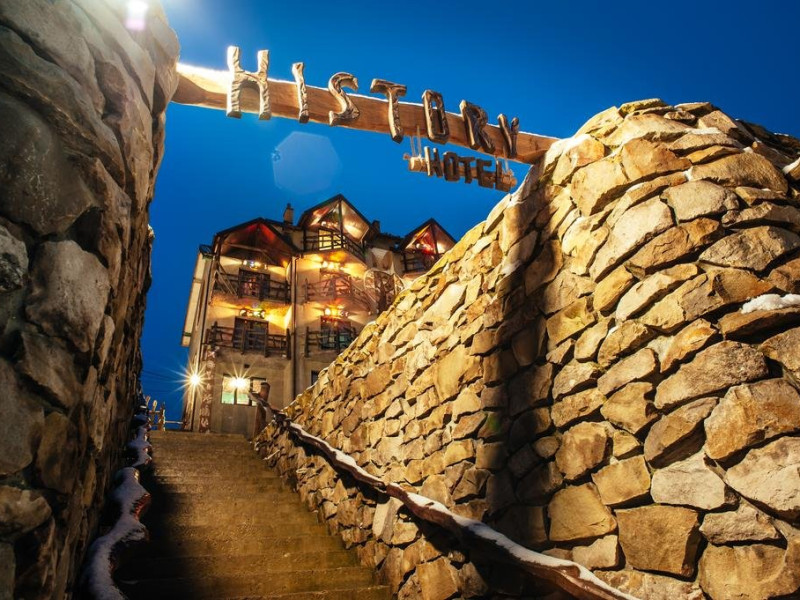 Localizare: In satul Polyanytsya, la 3 km de staTiunea de schi Bukovel. Descriere: Hotelul are patru etaje unde fiecare din cele 10 apartamente este proiectat in stilul perioadei particulare a istoriei ucrainene: Preistoria, cultura Trypillian, vremurile din Scythia, Rus, epoca domneasca, Serbdomoria, timpul cazacilor, miscarea de eliberare nationala, clasic. La parter este un apartament dublu 'Tineret'. La primul etaj sunt 2 apartamente Semi Deluxe ('Pestera' si 'Trypillia') si 1 apartament de doua camere Deluxe ('Scythia'). La etajul al doilea se afla 2 apartamente Semi Deluxe ('Kyiv Rus' si 'Serfdom') si 2 apartamente de doua niveluri Deluxe ('The Princely' si 'Cossacks'). La etajul al treilea sunt 2 apartamente Semi Deluxe ('UPA' - armata ucraineana de razboi si 'Classic'). Facilitati hotel: Receptie, ala de mese (cu semineu), tenis de masa, biblioteca istoriei ucrainiene, parcare (la 400 m de hotel cu transfer de la parcare la hotel), camera special amenajata pentru uscarea echipamentului de schi. Baie Rusa cu o piscina (intr-o casa separata) - 200 UAH pe 6 persoane pe ora, tariful pentru fiecare persoana suplimentara este de 25 UAH. Cel mai apropiat magazin este la 400 m. Dotari camere: Fiecare camera include un interior traditional carpatin si un balcon cu vedere la Muntii Carpati. Camera standard are un pat dublu, un dulap, un televizor LED 32, o masa, 2 scaune, un telefon intern, un seif, un balcon si o baie (dus, uscator de par, articole de toaleta). Suita semi-deluxe are un pat dublu sau 2 paturi de o persoana, un dulap, un televizor LED 32, o masa, 2 scaune, un telefon intern, un seif, un balcon si o baie (dus, uscator de par, articole de toaleta). Suit Deluxe are 2 paturi duble, un dulap, un televizor LED 32, o masa, 2 scaune sau banci, un frigider, un telefon intern, un seif, un balcon si o baie (dus, uscator de par, articole de toaleta). Astfel de apartamente, cum ar fi 'The Princely' si 'Cazaci', au doua nivele. Web:http://www.historyhotel.com.ua/