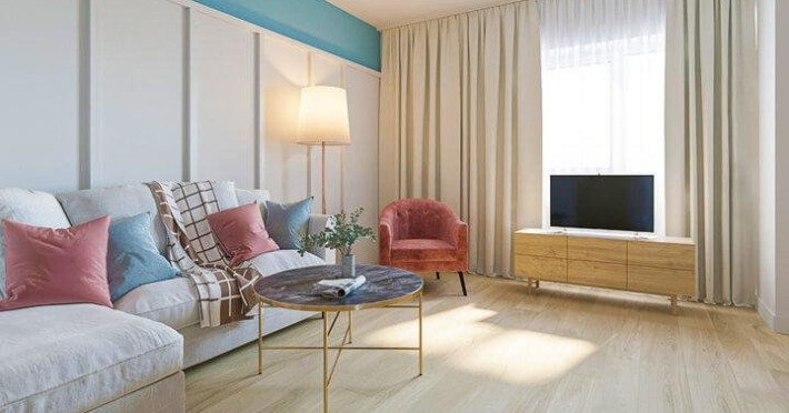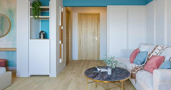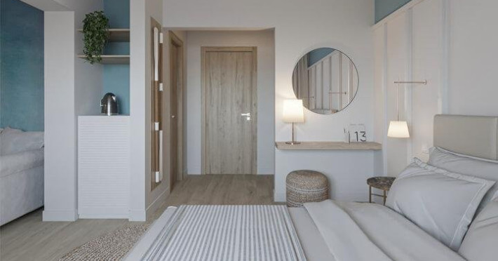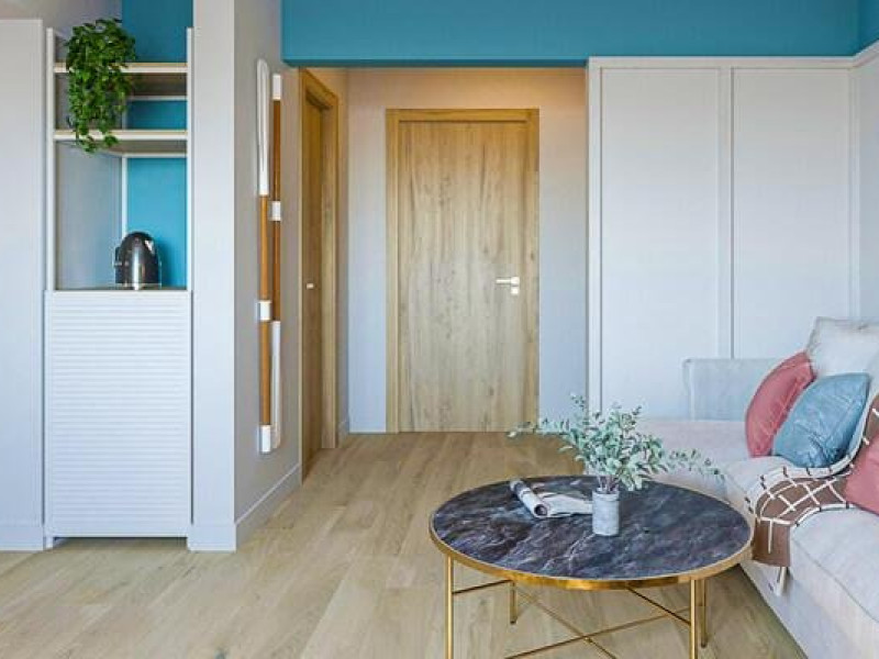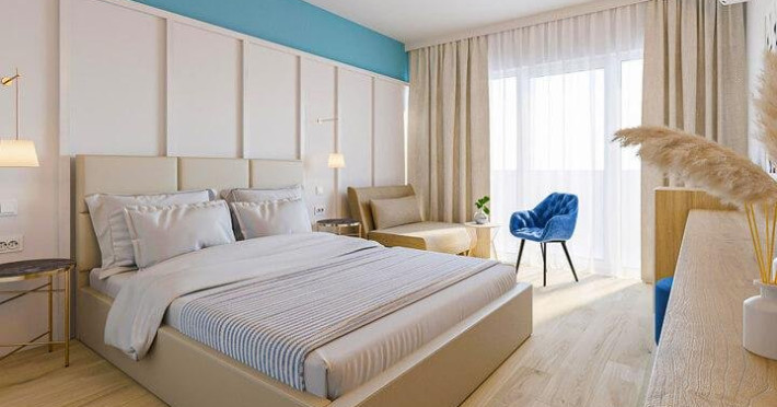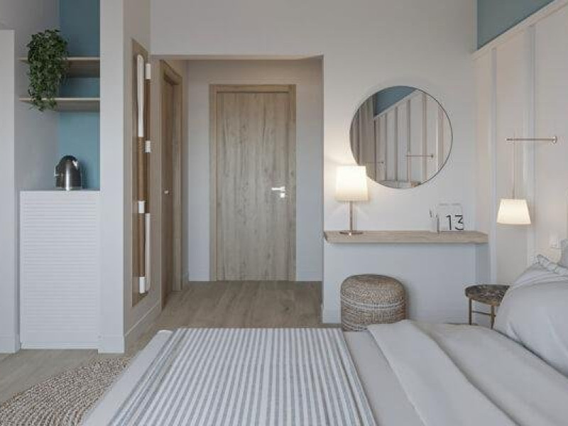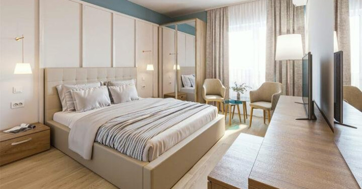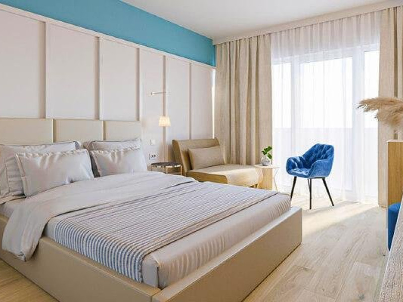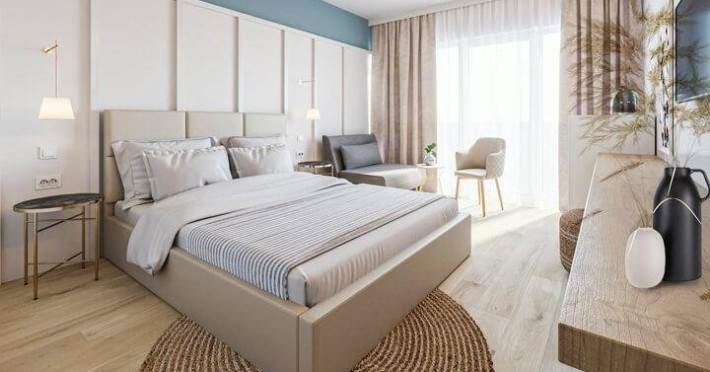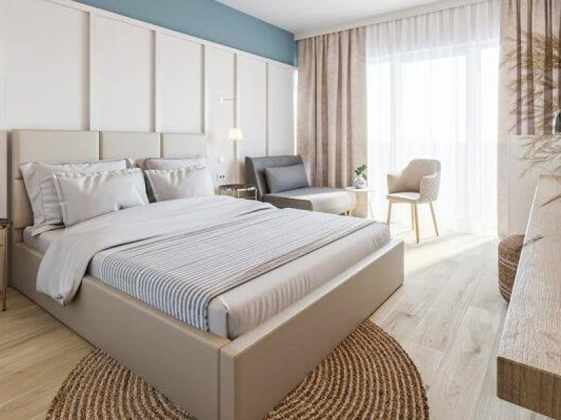Apartament 4* (dormitor + living) Dormitor cu pat matrimonial si living cu canapea extensibila. Apartamentul este open space, iar in living este spatiu pentru 1 pat suplimentar. Atat in dormitor cat si in living exista TV, iar in living exista AC si frigider si balcon.