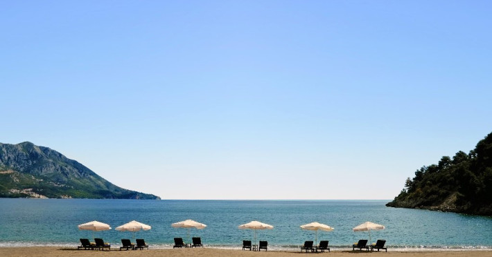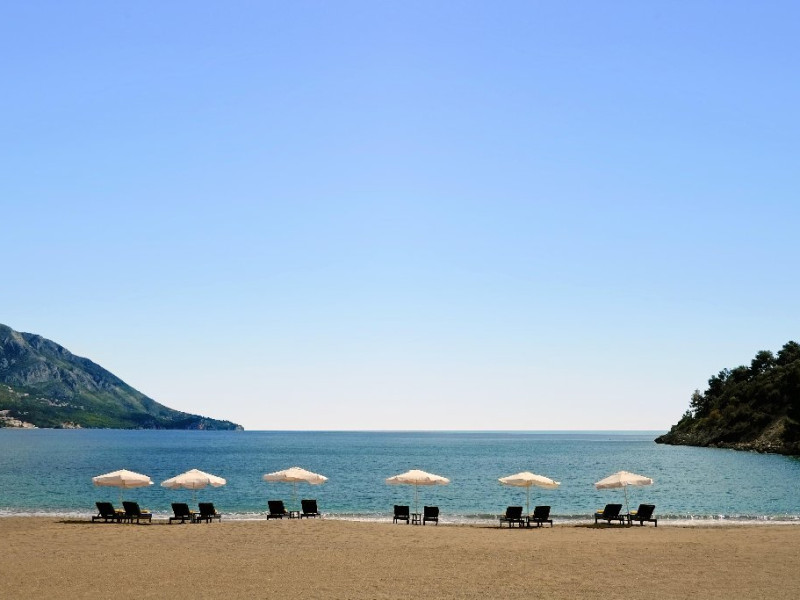 Plaja Plaja chiar langa hotel. Plaja cu pietris si pietre Becici. Sezlonguri si umbrele contra cost