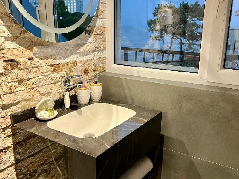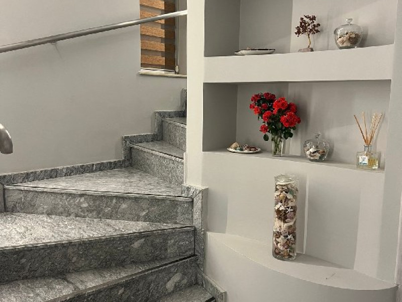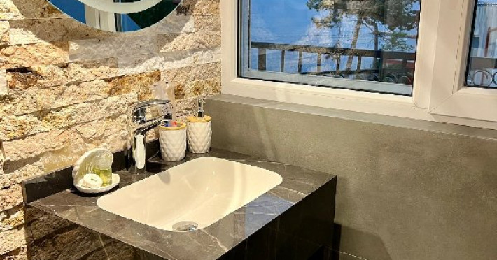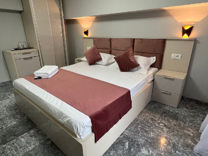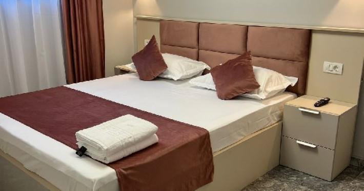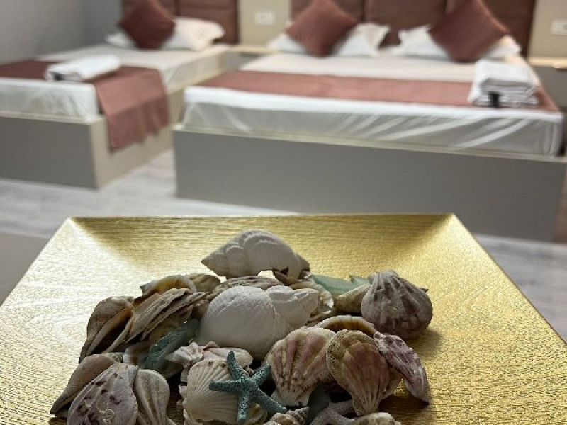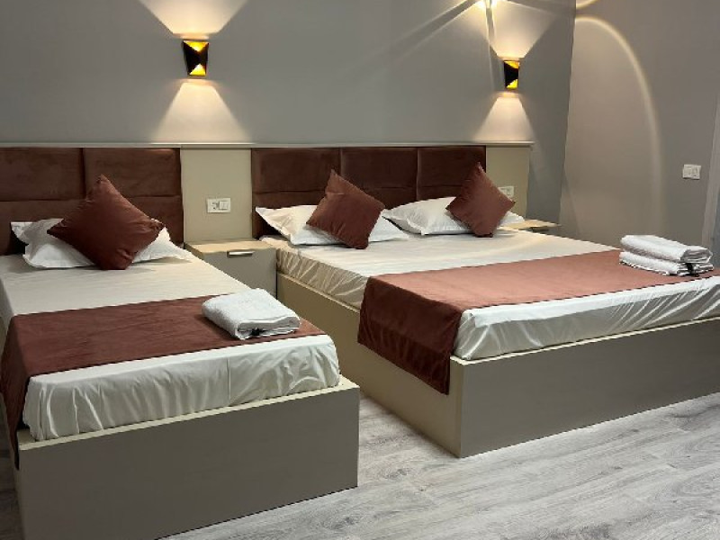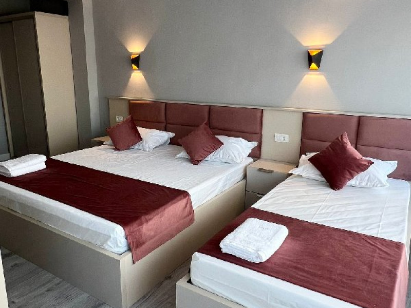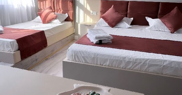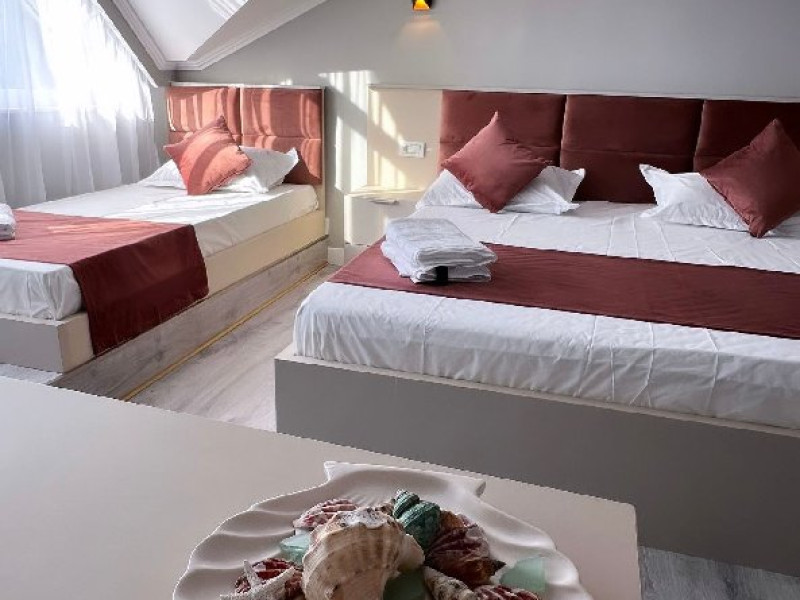 DESCRIERE CAMERE Numar total camere: 8 Camera Dubla Parter/ Demisol: 1 (pat matrimonial) Camera Dubla cu Terasa- Vedere Frontala spre Mare: 2 (pat matrimonial) Camera Tripla cu Balcon: 1 (pat matrimonial + pat single) Camera Tripla cu Terasa- Vedere Frontala spre Mare: 1 (pat matrimonial + pat single) Apartament cu 2 dormitoare- Parter: 1 (2 paturi matrimoniale, 1 baie) Apartament cu 2 dormitoare- Parter/ Demisol: 1 (2 paturi matrimoniale, 1 baie) Apartament cu 2 dormitoare, Terasa- Vedere Frontala spre Mare: 1 ( 2 paturi matrimoniale + 2 paturi single, 1 baie)