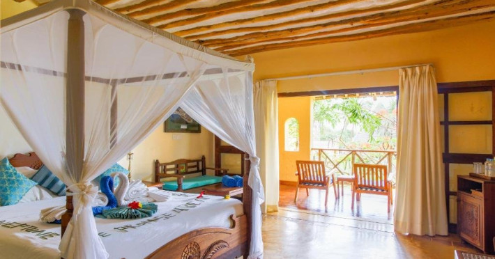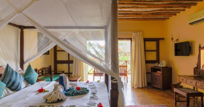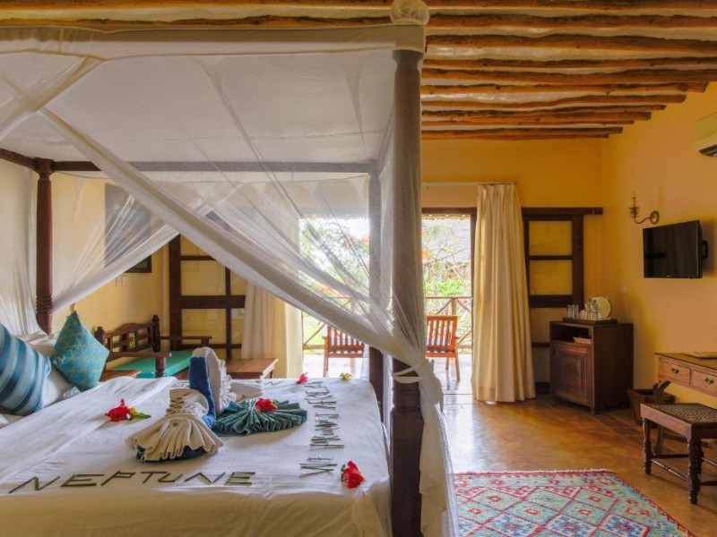 Dotari camere Complexul Neptune Pwani Beach Resort pune la dispozitia oaspetilor diverse tipuri de camere (duble cu vedere la mare sau ocean si suite luxoase), avand o capacitate maxima de patru persoane.