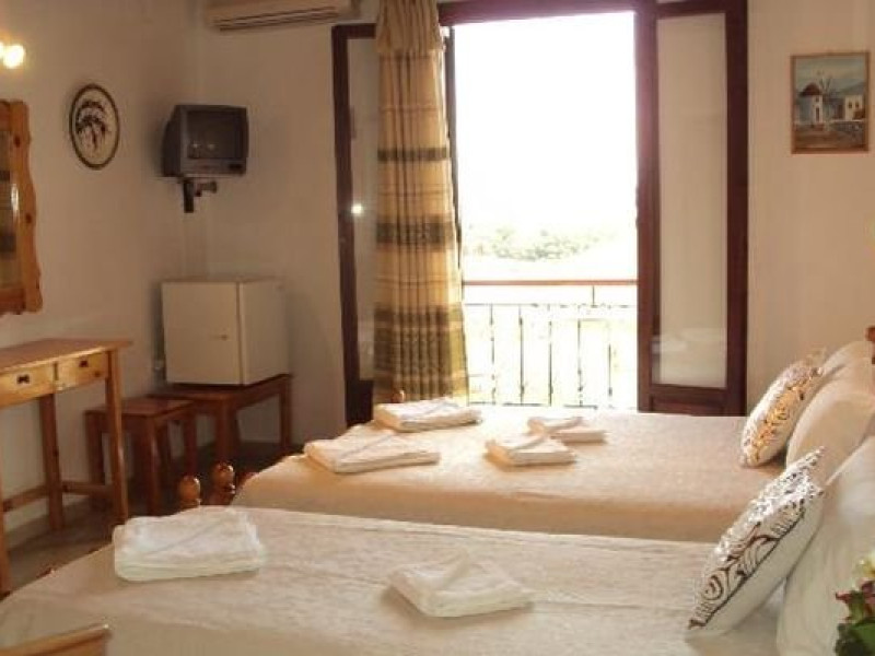Hotelul Nostos are 26 de camere. Dou dintre camere sunt single, iar celelalte douazeci si patru sunt camere duble care pot fi transformate in camere cu trei paturi. Toate camerele sunt dotate cu o baie privata, telefon, TV, frigider si aer conditionat. Pentru siguranta bunurilor valoroase ale clientilor exista un seif central. Hotelul dispune de parcare.