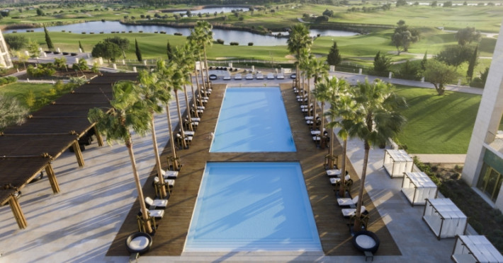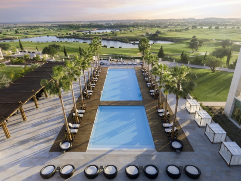 The hotel includes a 24-hour reception, Wi-Fi in public areas, golf bag storage rooms for groups, two outside pools for adults and one for children, one heated indoor pool with hydro-massage circuit (minimum age 16), T/Kids and exclusive facilities for families.