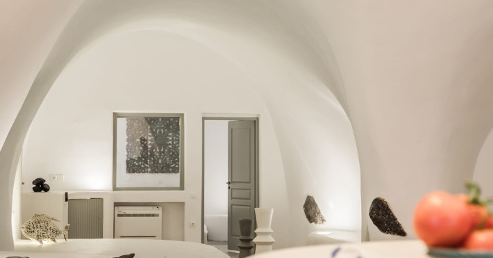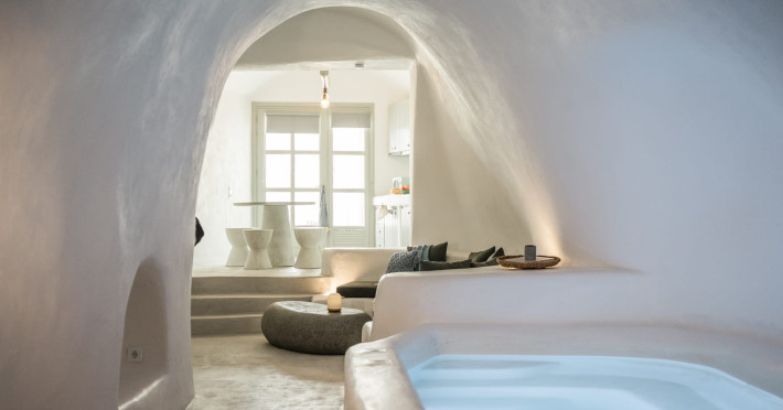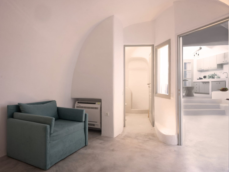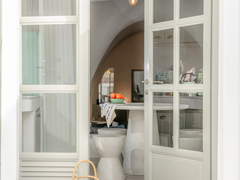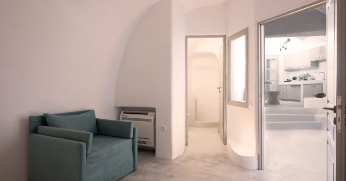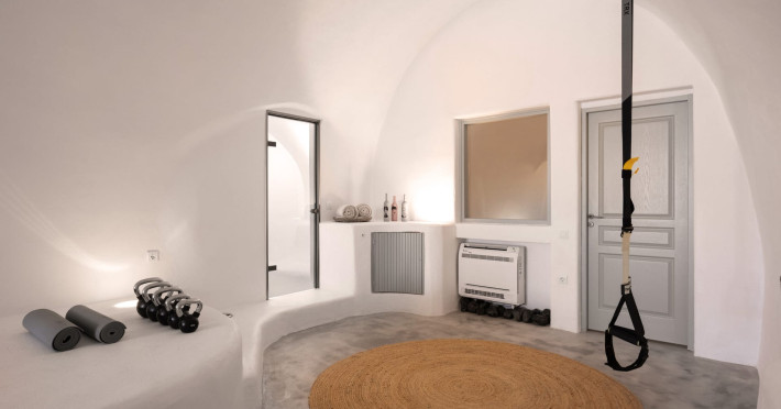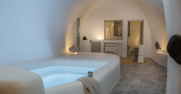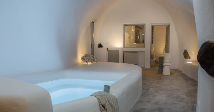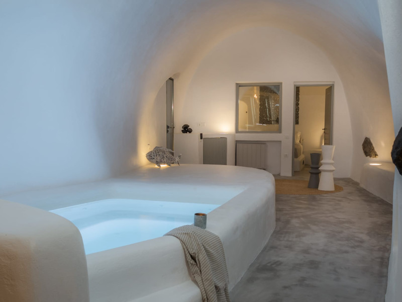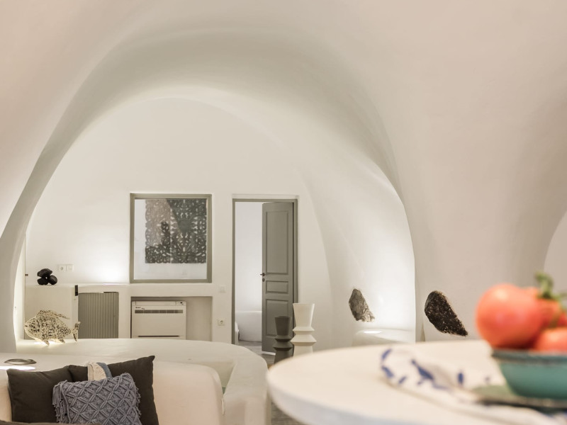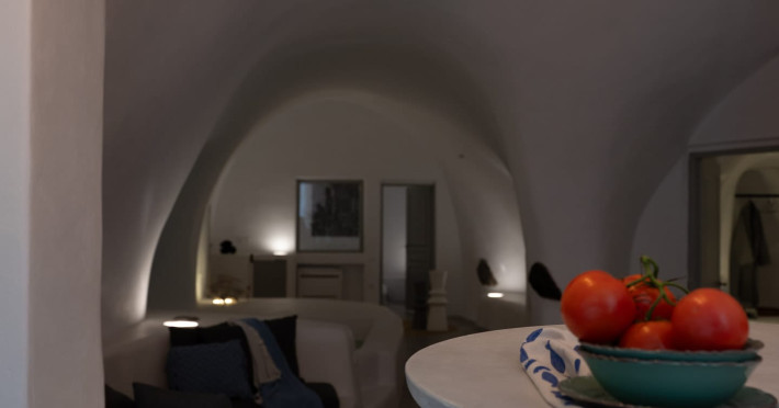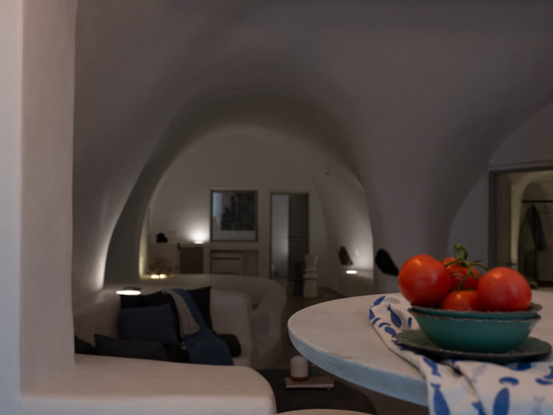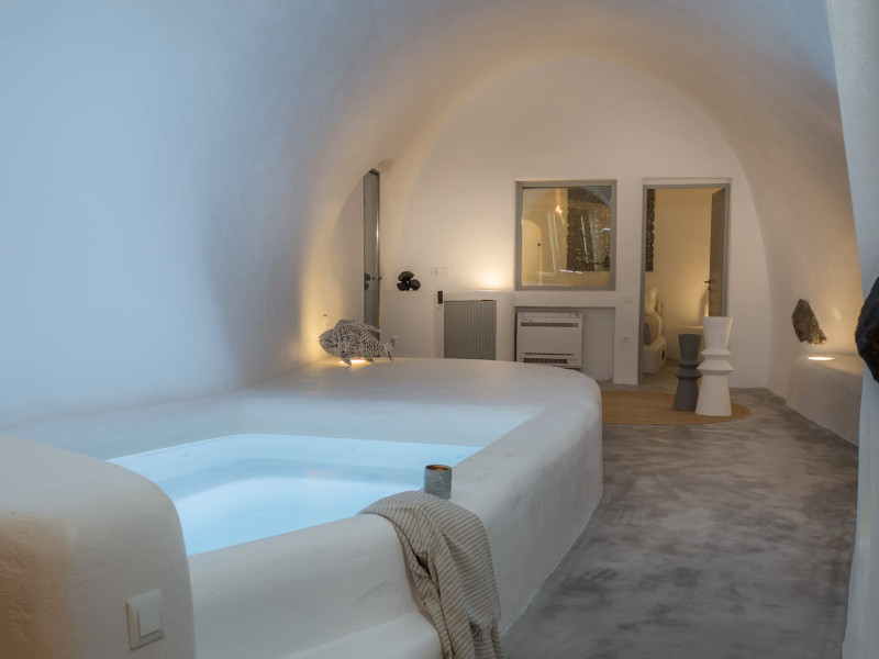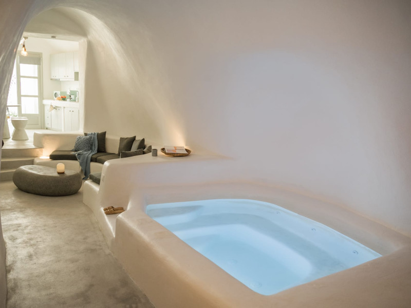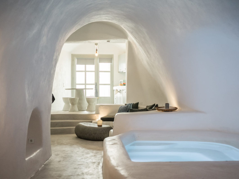 Cave House Villa – A minimal luxury villa nestled in the peaceful village of Megalochori, Santorini. Carved into the volcanic rock and inspired by traditional Cycladic architecture, the villa masterfully blends timeless elements with modern design. It features two king-size bedrooms with orthopedic mattresses, two full bathrooms, a heated jacuzzi, private hammam, mini gym, a fully equipped kitchen, and a cozy lounge area.The spacious veranda and rooftop terrace open up to panoramic views of the caldera, the Aegean Sea, and Santorini’s iconic sunsets. The whitewashed, minimalist palette and curated amenities elevate both the aesthetic and the essence of the experience.Ideal for couples, families, or friends seeking luxury, tranquility, and design in the heart of Santorini. Just a few steps from Megalochori’s charming village square, and only a short drive from Fira, Imerovigli, and renowned local wineries.